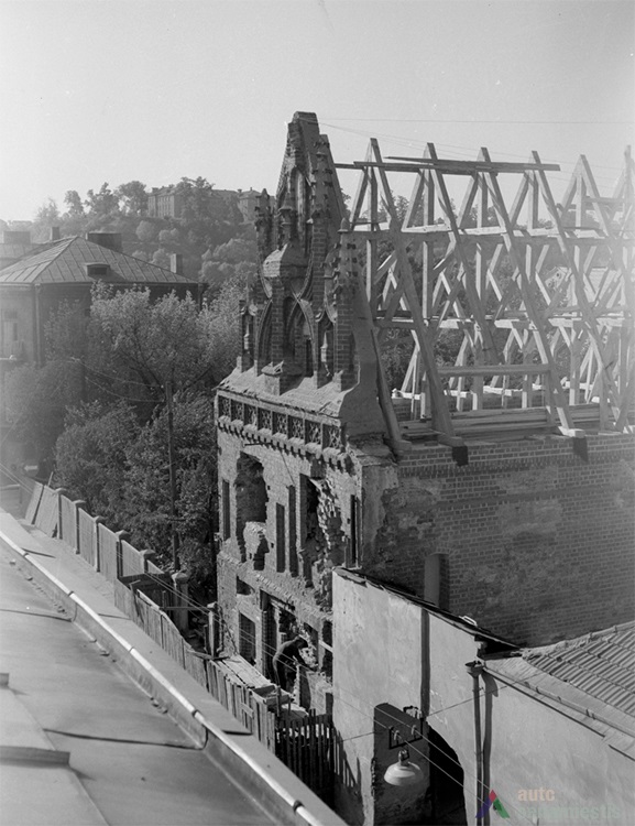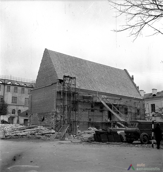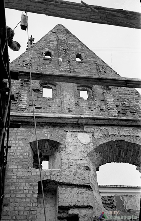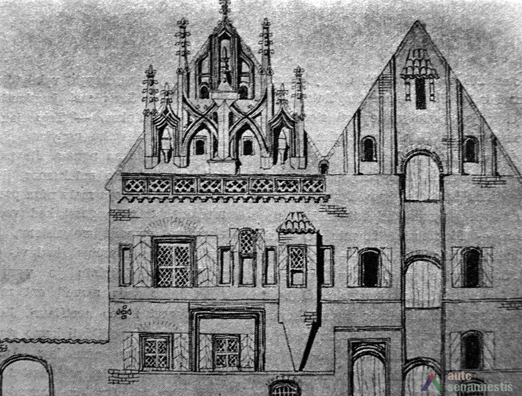 The architectural research which started in 1960 has uncovered traces of five different time periods: the construction periods of the 15th and 16th century, the early reconstructions of the 17th and 18th century, and the reconstructions of 1850 and 1928. After the removal of the façade plastering and the shell mortar layers of later periods, a lot of the remaining Gothic masonry was discovered in the western, southern and northern façades. The research has fully revealed the building’s structure, wall construction, thickness, masonry techniques, surface textures and finishes. The location of all three ceiling joists was discovered. After compiling the hypothesis and the results of the research, the bay window was reconstructed. The reconstruction of the western (back) façade and staircase annex were conducted with a lack of exact data.