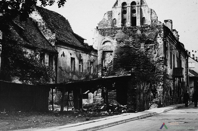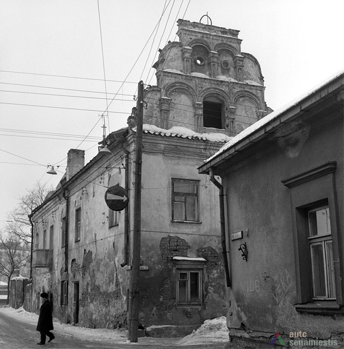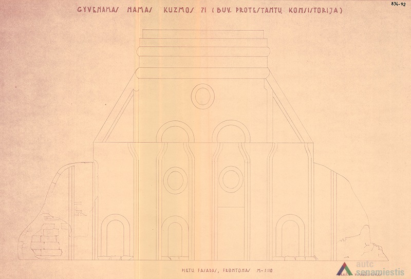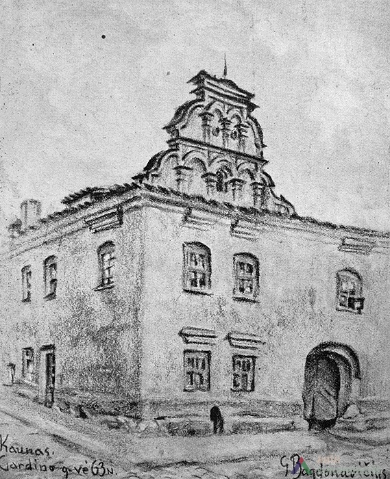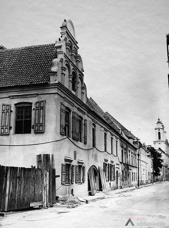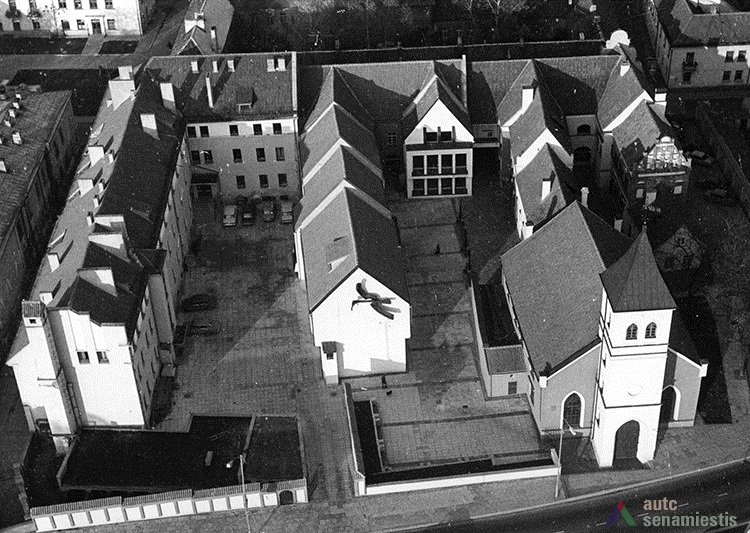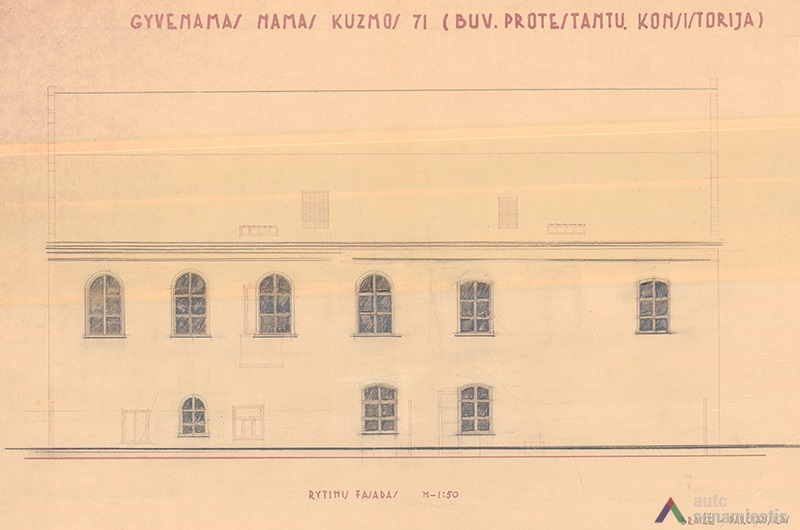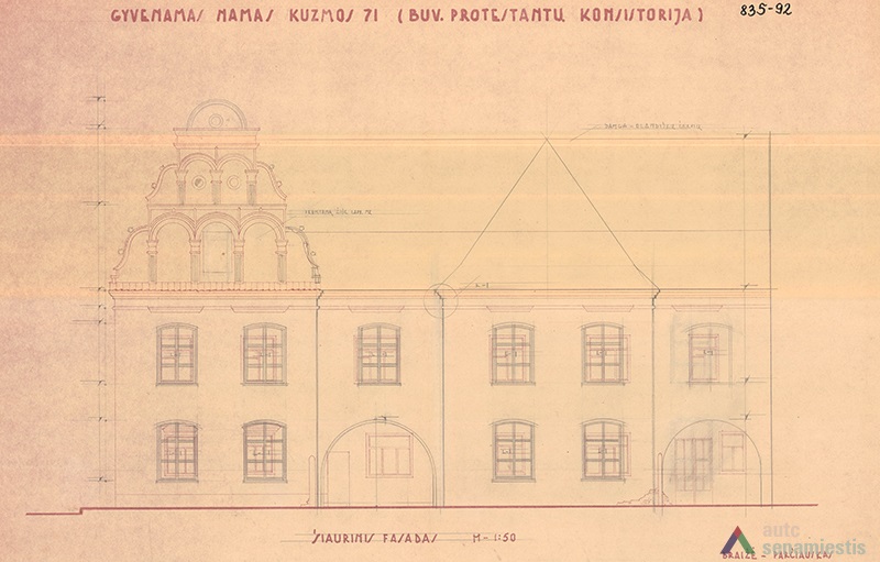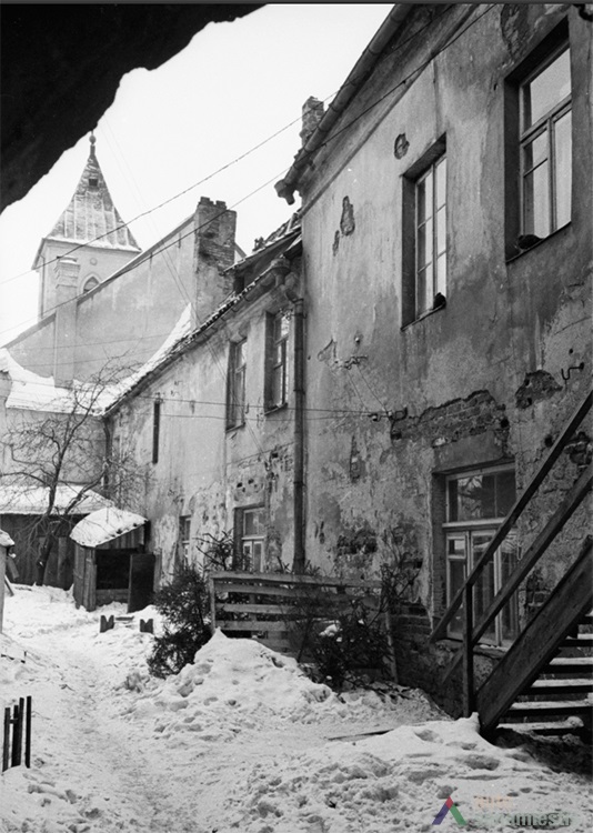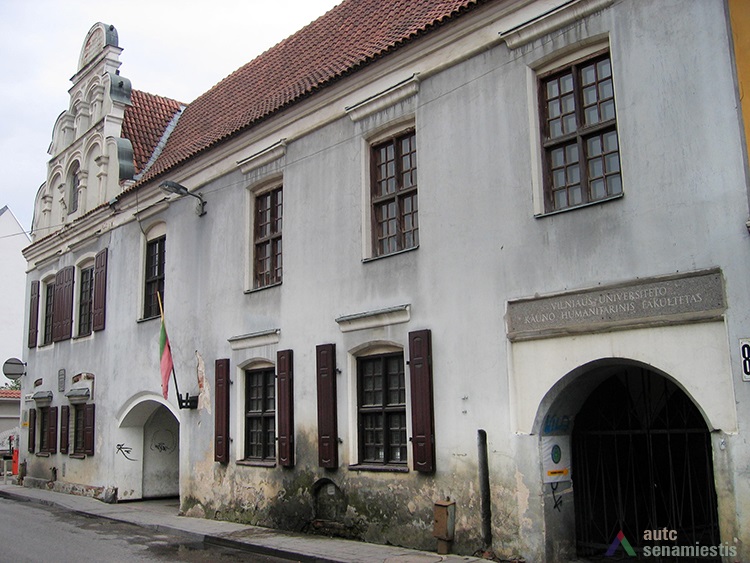 Although large scale reconstruction and renovation works were undertaken on the buildings of this block, no archaeological research has been conducted on the site. Data of the architectural research is also lacking, thus the development of the block can be described using the sparse historical sources available. It is known that the western edge of the block was occupied by the customs house from the 15th century. Possibly, a row of land plots owned by townspeople ran along the whole block and the ends reached the raised slope of the River Nemunas. Stone buildings, as far as can be told, were first constructed here at the beginning of the 17th century. The residential buildings of the first half of the 17th century, which had been adapted for the needs of the Lutheran consistory, stood facing the main street. The building on the corner of Kuzmos and Naugardo streets stands out for its expressive façades, and is finished in grey plaster. In the middle of the 17th century the construction of this building was overseen by Hanusas Naugardas, Kaunas magistrate advisor and member of the Lutheran parish council. This building was handed over to the Lutheran parish in 1676.