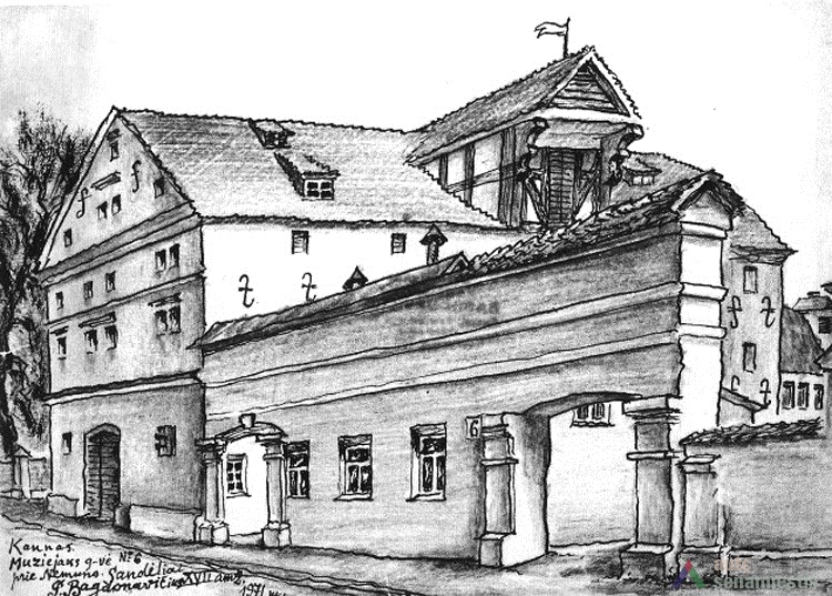 1853 m. žemės sklypą su mediniu užstatymu įsigyjo pirklys S. Gotkevičius, kuris 1854 m. (data ant vėtrungės) pastatė mūrinį, trijų aukštų svirną Santakos ir Muziejaus gatvių kampe. 1885 m. statinys kapitaliai atremontuotas.[4] 1896 m. čia stovėjo triaukštis, dvišlaičiu stogu svirnas dengtas čerpėmis, jame buvo 60 langų (pirmame aukšte langai su medinėmis langinėmis), 4 mediniai laiptai, perdangos medinių balkių, palėpėje įrengtos dvi patalpos. Statinys buvo naudojamos grūdams laikyti.[5]