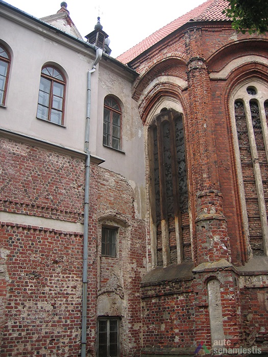 Dėl pavasarinių potvynių visi pastatai sklype grupavosi rytinėje dalyje ant aukštesnės terasos. Matyt Nemuno ir Neries vandens pakilimas buvo dažnas ir įprastas reiškinys, nes Makovskio graviūroje laivai išrikiuoti prie pat vakarinio bažnyčios fasado, nors iš tiesų čia buvo bernardinų sodo ir daržų teritorija. Vienuolyno[2] ir miesto žemes skyrė tik siauras Bernardinų skersgatvis, kurio vakarinė kraštinė sutapo su vienuolyno rytine siena. Būtent ši ypatybė sąlygojo rytinio fasado struktūrą – pirmasis aukštas suformuotas kaip apsauginė siena. Jame įrengti tik keli langai su aukštai iškeltomis palangėmis, kad joks žmogus negalėtų pamatyti, kas dedasi viduje. Kiemo fasadai, atskirti nuo miesto mūrine tvora, daug atviresni. Pirmojo aukšto patalpos šviesios su erdviais aukštais langais. Pietinio fligelio vakarinis fasadas papuoštas laiptuotu frontonu, skirtu Nemunu atplaukiančių Kauno svečių pasigėrėjimui.