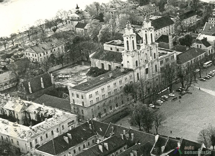 Per 1655-1661 m. karą jėzuitai buvo priversti pasitraukti iš Kauno, o po okupacijos grįžę atgal rado tik savo statinių griuvėsius.[1] 1663 m. vienuolija nupirko kampinį sklypą su pastatų griuvėsiais prie T. Daugirdo g. ir pradėjo karo metu sugriautų pastatų atstatymą ir remontą. 1668 m. valdos išsiplėtė – buvo isigytas rytinėje pusėje esantis sklypas ir jame esantys griuvėsiai. 1669 m. jėzuitai atstatė karo metu sugriautą koplyčią. 1670 m. įsigijo toliau nuo aikštės, prie Aleksoto g. esantį sklypą su vadinamuoju Perkūno namu bei gretimus, kiek apgriuvusius namus. Pagaliau 1671 m. nusipirko penktąjį, Aleksoto g./Rotušės a. kampe esantį sklypą, su karo metu sugriautais statiniais jame.