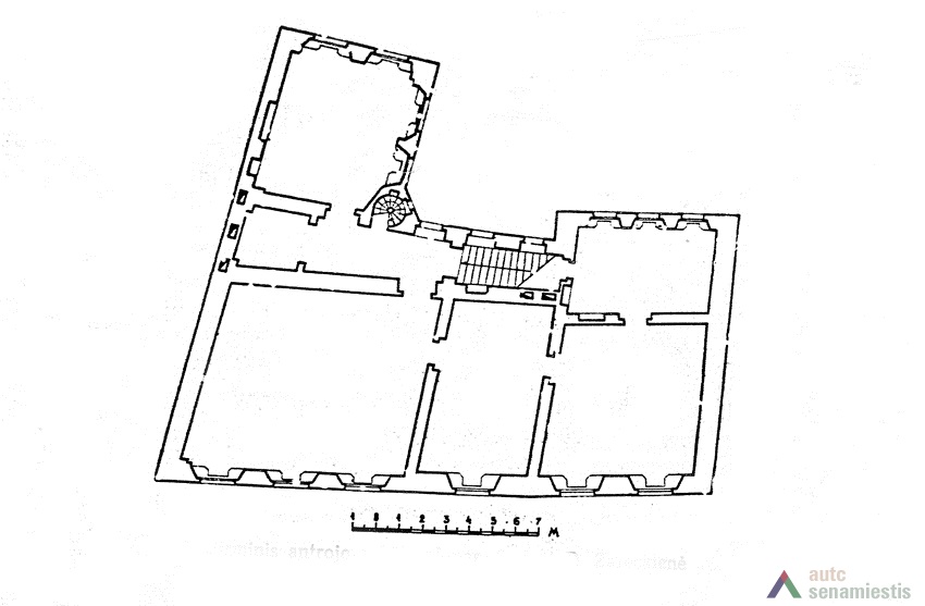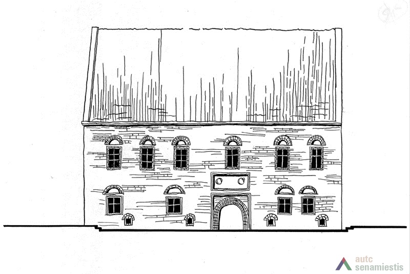 Pirminės statybos metu buvo suformuotas tradicinės stačiakampės formos dviejų aukštų pastatas, dviem skersinėm kapitalinėm sienom padalintas į tris dalis[1]. Yra išlikusios šio laikotarpio antro aukšto langų angos Vilniaus g. fasade ir viršlanginės pirmo aukšto langų nišelės.