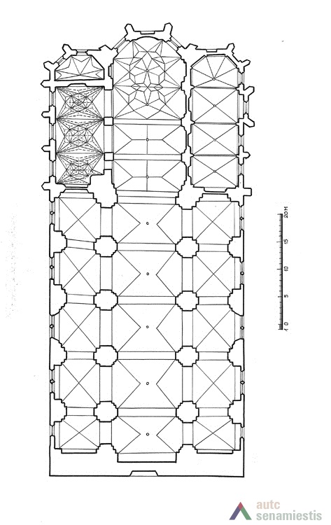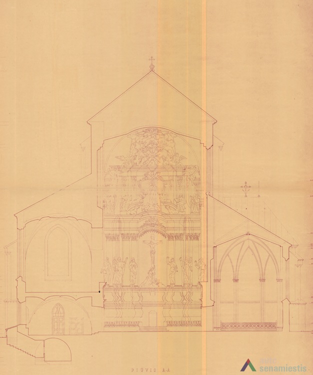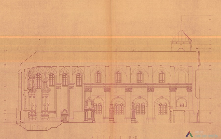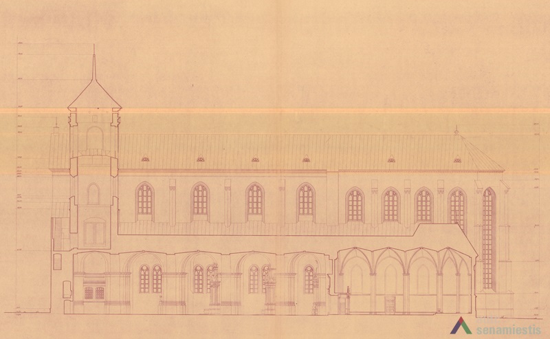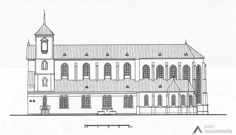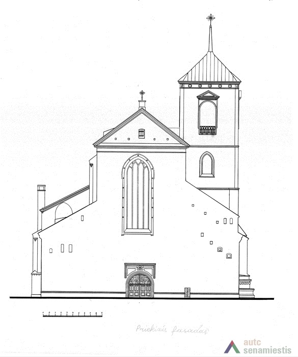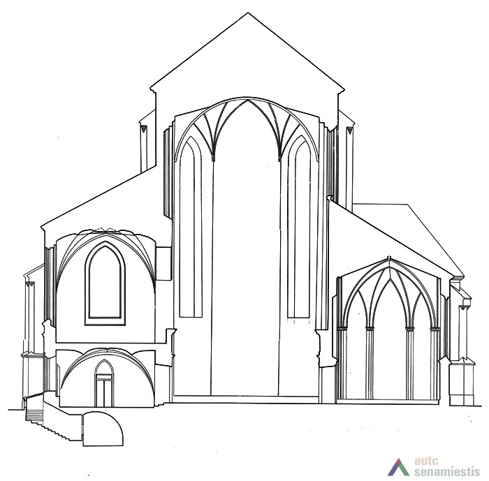 a) presbiterija ir zakristija, besiglaudžianti šiaurinėje presbiterijos pusėje sumūrytos XV-XVI a. sandūroje. Tuo laiku pradėtos mūryti ir pagrindinio tūrio sienos. Tai patvirtina gotikinis plytų rišimas, randamas šoninių navų, presbiterijos ir vakarinės sienos apačioje bei juodų plytų rombiniai raštai, būdingi daugeliui XV-XVI a. Kauno senamiesčio pastatų. Iki šių dienų presbiterijoje išliko to laikotarpio tinklinio skliauto fragmentas ir krištolinis zakristijos skliautas.