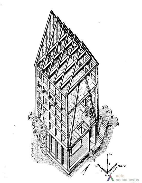 Pagal pastato radinius jis datuotas XIV ir XV a. sandūros laikotarpiu. XV a. pradžioje čia būta medinio namo su mediniu pusrūsiu, o virš perdangos pirmame aukšte stovėjo puodyninių koklių krosnis[2]. Atrasta tam laikotarpiui būdingos formos lipdytų ir po to apžiestų puodyninių koklių kryžmine anga. Jų forma ir kiekis leidžia įsivaizduoti būdingą tokio tipo pastatams krosnį, įrengtą patalpos kampe[3].