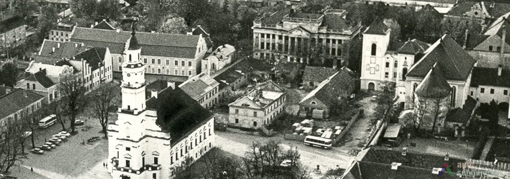 Rekonstruojant šios miesto dalies raidą gelbsti Maironio name išlikę ankstesnių pastatų rūsiai[6] ir tyrimai Rotušės a. 14[7]. Jie leidžia atkurti kelias gretimas posesijas, o istoriniai tyrimai, bylojantys apie spėjamas devynias posesijas, teikia papildomų argumentų[8]. Žvalgant vyskupijos kiemą buvo atrasta gretimų sklypų riba – mūrinės sienos pamatas, o abipus jos rasti XVI a. pabaigai būdingi miestiečių namų rūsiai[9]. Kiemuose už minėtų pastatų buvo įrengtos mažesnės hipokaustinės krosnys, dydžiu labiau primenančios pirtis. Tad galima manyti šioje senamiesčio dalyje buvus šešias skirtingų pločių posesijas[10]. Vakariniame Rotušės aikštės krašte kaip gatvė buvo naudojama 8 m pločio aikštės juosta.