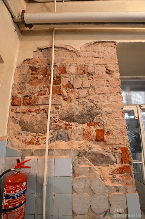 Aleksoto gatvės fasadas margintas perdegtų juodų plytų rombiniu raštu. Vienintelis jame buvęs, pirmo aukšto langas įrengtas šiaurinėje dalyje prie Muitinės gatvės. Netoli jo – rūsio švieslangis. Muitinės gatvės fasade rasta durų anga, lango angokraštis ir keturios puošybinės nišos – „saulutės“. Abu pastato fasadus juosia frizinė juosta. Kiemo fasade, apie 10 m nuo Muitinės gatvės, rastos dviejų pirmojo laikotarpio langų ir durų į pirmojo aukšto patalpas angos. Fasado viduryje – durų anga su smailiaarke sąrama. Beveik visos angos bei frizinė juosta puoštos kampu sumūrytų plytų apvadais. Pastato viduje Aleksoto gatvės sienoje rasti kelių nišų angokraščiai. Buvusių skersinių pertvarinių sienų vietų nustatyti nepavyko.